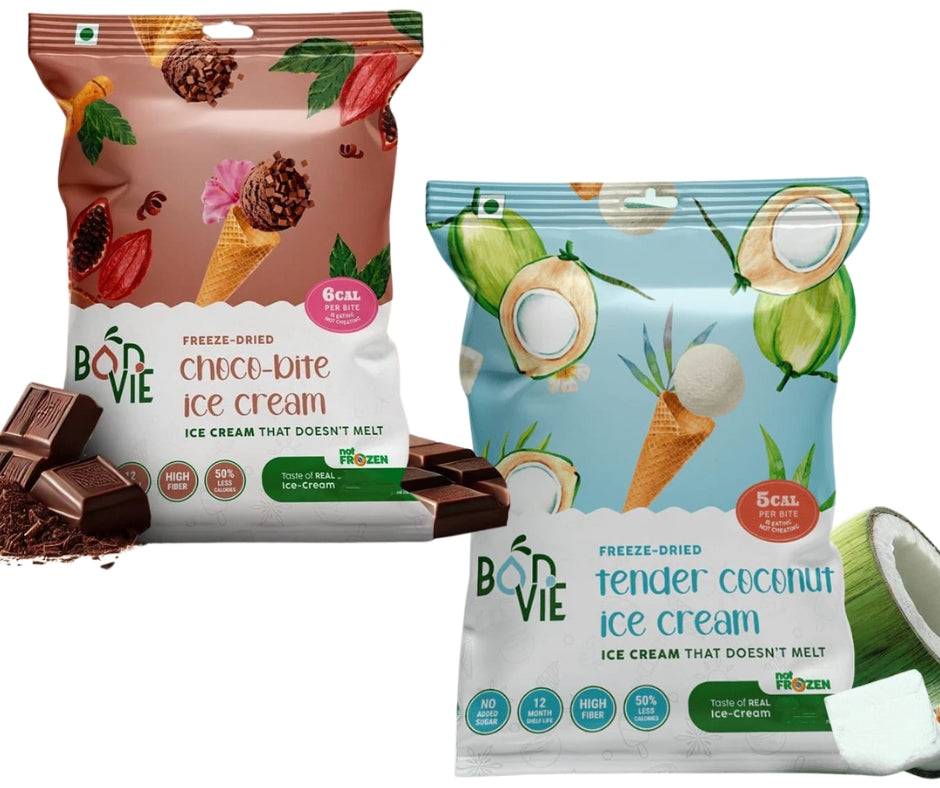 Experience the best of both worlds with our Chocolate-Coconut Ice-cream Snacks —freeze-dried Tender Coconut and Choco Bite Ice Creams. Enjoy the tropical freshness of tender coconut and the rich indulgence of real cocoa in one convenient, no-mess pack. Creamy, preservative-free, and refrigeration-free, it's the perfect guilt-free treat for anytime, anywhere snacking. Taste luxury, travel light—grab your combo now!
