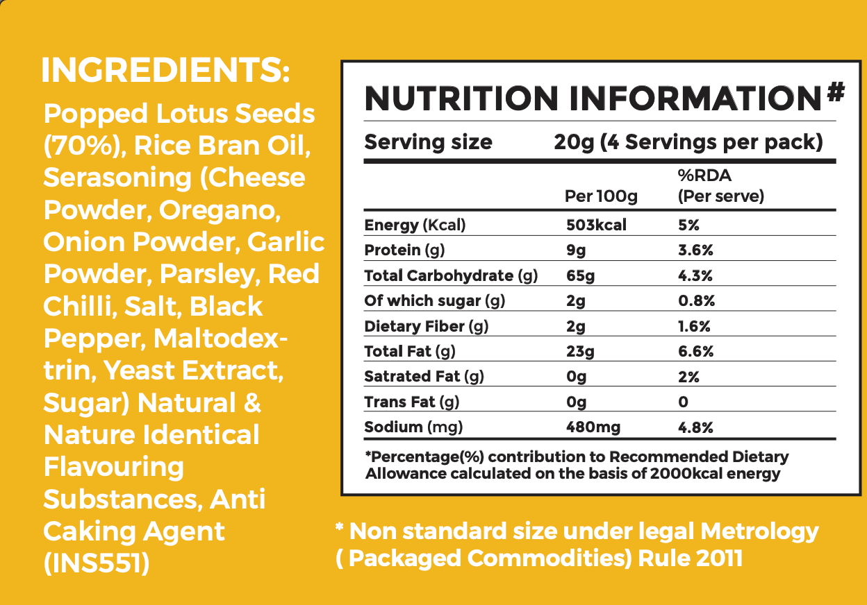 Satisfy your cheesy cravings the healthy way with our Cheese & Herb Makhana – a delicious blend of rich, cheesy flavor and aromatic herbs, all wrapped around a light, crunchy bite. Made with clean, plant-based ingredients, this snack delivers indulgent taste without the guilt. Perfect for movie nights, snack breaks, or anytime you want a savory treat that’s big on flavor and better for you.
